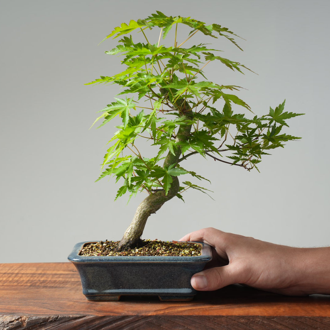 This Dwarf Japanese Maple (Acer palmatum – seedling) features a sinuous well-developed trunk with elegant movement and the beginnings of refined branching. Its fresh spring foliage emerges in a vibrant blend of red and green, offering seasonal beauty and refined character.