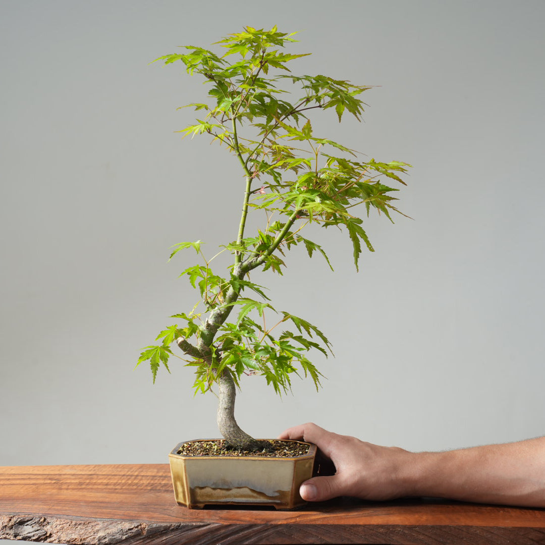 This Dwarf Japanese Maple (Acer palmatum – seedling) features a sinuous well-developed trunk with elegant movement and the beginnings of refined branching. Its fresh spring foliage emerges in a vibrant blend of red and green, offering seasonal beauty and refined character.
