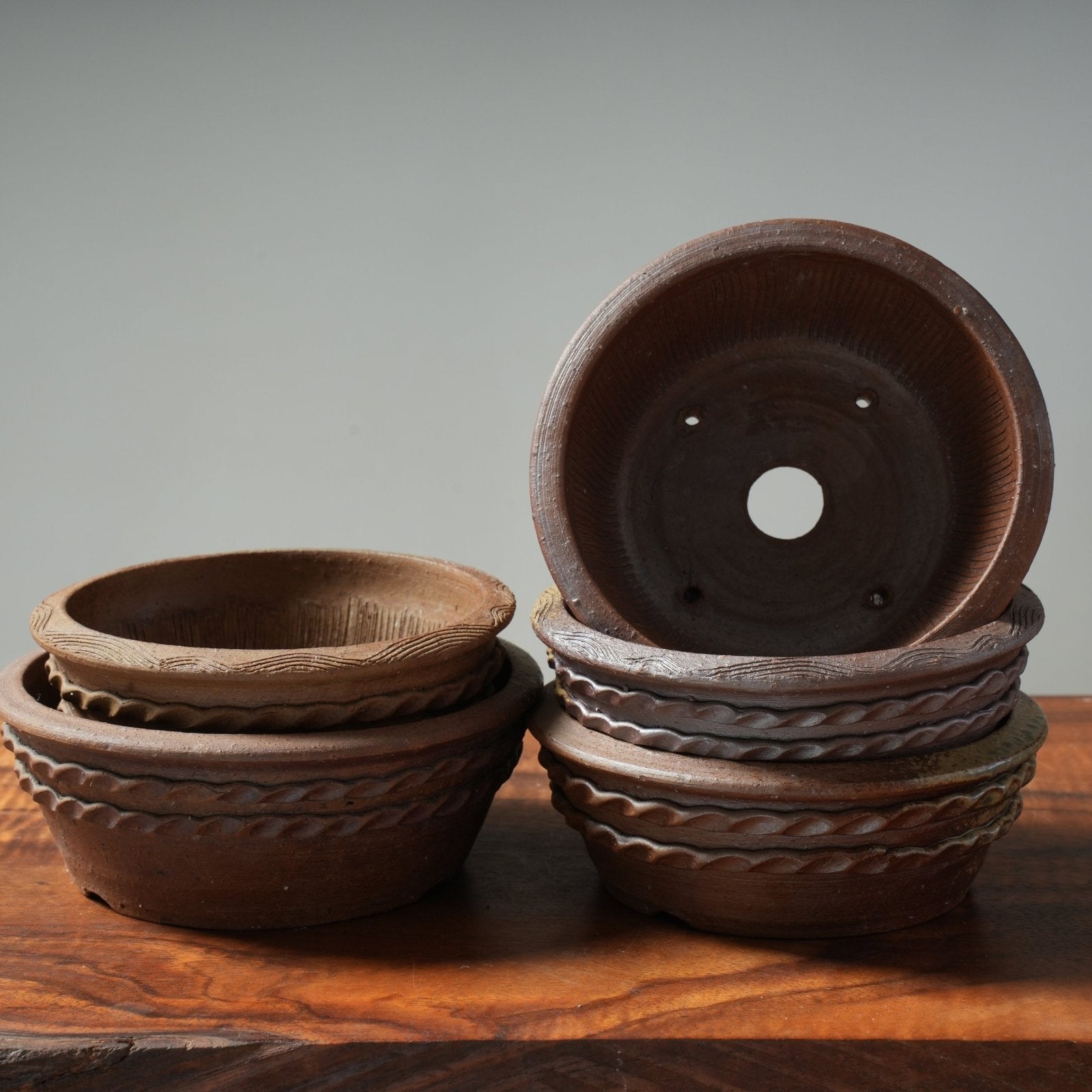 Mitunobu Ito Ash-Tinged Rope Motif Round Medium Bonsai Pot