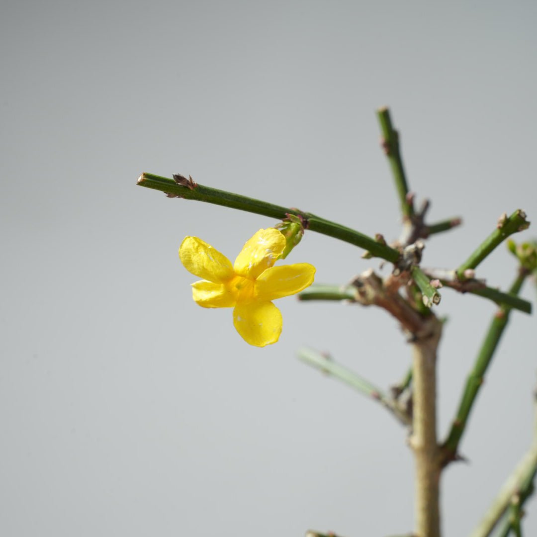 Winter Jasmine (Jasminum nudiflorum) is native to China, and valued for its winter blooming period. At our growing grounds in California they bloom starting in mid-January, about the same time as Ume (Japanese Apricot). This makes them a great species for winter bonsai shows, or winter cheer in your garden.